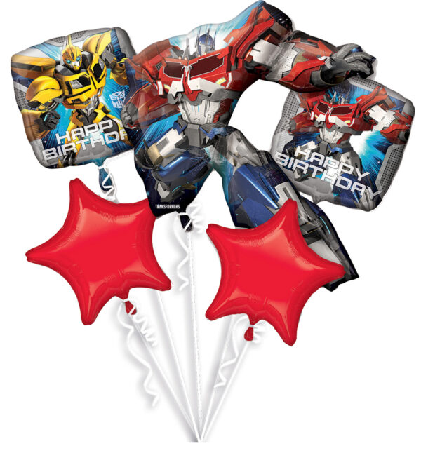 Buchetul include 5 Baloane Folie Roboti Transformers: 2 model patrat Happy Birthday, 2 model stea rosii si 1 figurina Transformers Optimus Prime SuperShape 81 x 88 cm. Baloanele se pot umfla cu heliu sau aer.