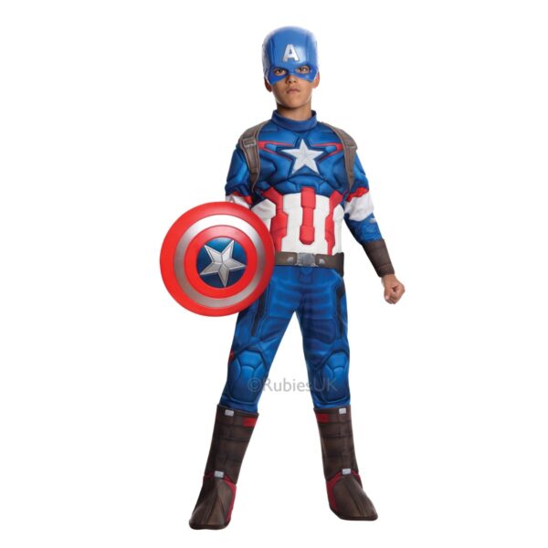 Costum Deluxe Captain America captusit, cu manusi atasate, ghete si masca mulata 100% Poliester. Se recomanda spalarea manuala. Varsta 3-4 ani