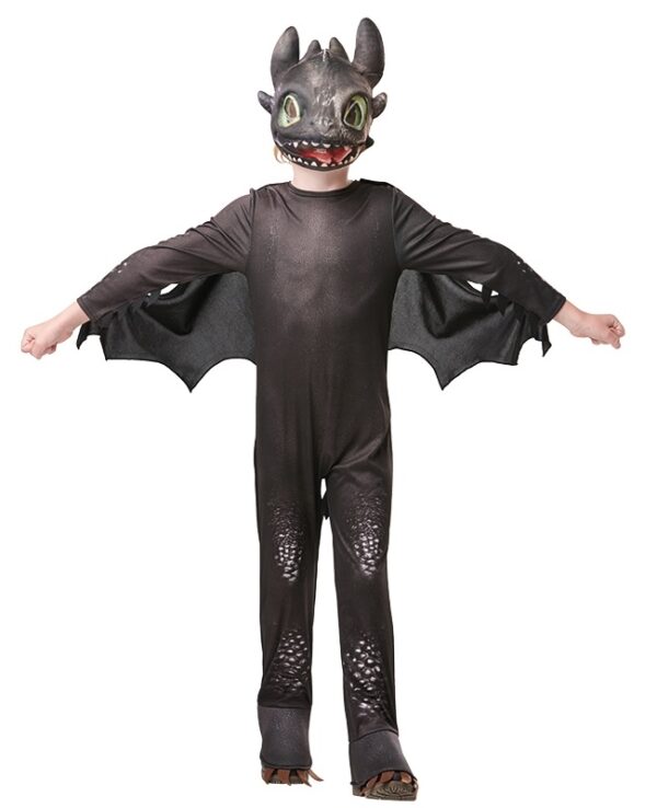 Costum Dragon Toothless include salopeta neagra cu imprimeu solzi, acoperitoare incaltaminte, aripile detasabile si masca in relief.