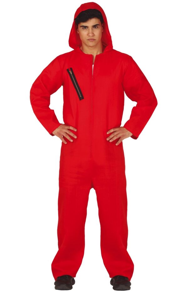 Costum Salopeta Rosie. Costumul Casa de Papel include salopeta rosie cu inchidere prin fermoar in partea din fata, gluga si fermoarul negru decorativ.