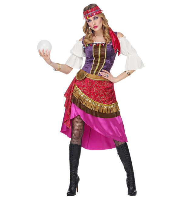 Costum Tiganesc Gipsy include rochia si bandana rosie cu ciucuri colorati aplicati.