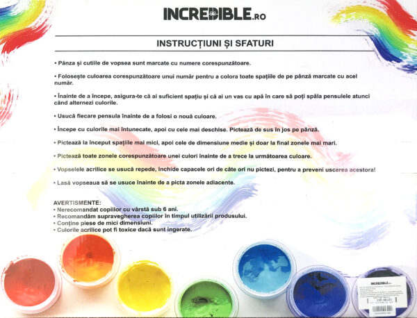 Kitul de pictura contine panza de calitate intinsa pe o rama de lemn de 40×50 cm, un set complet de culori acrilice necesare, 3 pensule de diferite dimensiuni, elemente de prindere pe perete si o imagine de referinta. Decoratiune DIY pentru casa ta – creeaza-ti propria capodopera si arata-le tuturor ce ai reusit sa pictezi. Activitatea perfecta alaturi de cei dragi – aduna familia in jurul panzei si contribuiti cu totii la pictura. Acest set de pictura foloseste panza de calitate superioara, intinsa perfect pe o rama de lemn natural, pentru ca tu sa te bucuri la maxim de experienta de a creea o capodopera. Folosim doar culori acrilice de calitate superioara, cu un grad foarte bun de acoperire. Cele 3 pensule de dimensiuni diferite iti ofera precizie si sporesc placerea de a picta. Fiecarei culori numerotate ii corespund diferite zone marcate pe panza. Picteaza zonele individuale pentru a realiza un tablou spectaculos. Studiile arata ca anumite activitati precum coloratul sau desenatul reduc nivelul de stres si te ajuta sa te relaxezi. Daca nu ai experienta cu picturile pe numere nu iti fa griji – kitul complet de pictura vine intr-o superba cutie de transport pe care ai instructiuni detaliate si sfaturi utile. Pictatul pe numere este un hobby relaxant si satisfacator, pe care il poti practica la tine acasa, in siguranta. Cum se foloseste? Panza si cutiile de vopsea sunt marcate cu numere corespunzatoare. Foloseste culoarea corespunzatoare unui numar pentru a colora toate spatiile de pe panza marcate cu acel numar. Inainte de a incepe asigura-te ca ai suficient spatiu si ca ai un vas cu apa in care sa poti spala pensulele atunci cand alternezi culorile. Usuca fiecare pensula inainte de a folosi o noua culoare. Alte sfaturi utile: Picteaza la inceput spatiile mai mici, apoi cele de dimensiune medie si doar la final zonele mai mari. Picteaza toate zonele corespunzatoare unei culori inainte de a trece la urmatoarea culoare. Lasa vopseaua sa se usuce inainte de a picta zonele adiacente.