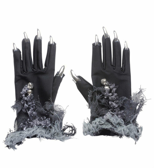 Manusi negre cu unghii argintii si clopotei. Un accesoriu potrivit atat pentru o deghizare de vrajitoare cat si pentru cea de pisica.