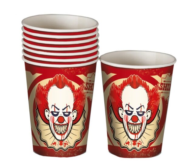 Pahare Clown Horror 8 Buc potrivite pentru petrecerea de Halloween. Un set contine 8 pahare din carton. Sa inceapa petrecerea!