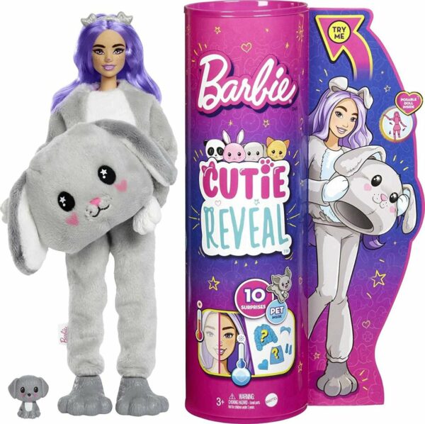 Papusile Barbie? Cutie Reveal? iti ofera cea mai dragalasa experienta de unboxing! Pachetul ascunde o papusa Barbie? imbracata in costum de catel gri?si 10 super surprize! Deschide pachetul pentru a gasi un prieten – catel gri moale si pufos, dar si patru genti surpriza. Scoate costumul de catel pentru a descoperi frumoasa papusa Barbie? cu parul lung, multicolor si detalii stralucitoare. Deschide apoi pungile surpriza pentru a descoperi hainele papusii, accesorii, un pieptan cu un mini burete atasat, dar si un mic catelus, de plastic.Partea de sus a costumului se inverseaza si devine o jacheta din lana super moale pentru papusa Barbie, iar capul costumului se transforma si intr-un pat pentru animalute! Surprizele continua! Foloseste pieptanul cu burete si apa rece ca gheata pentru a spala fata papusii si a catelusului ei. Fata papusii Barbie? se va transforma, iar catelusul?ei va ?deschide si inchide? ochii ? atat de dragut! Fenomenul poate fi inversat folosind apoi apa calda. Descopera toate surprizele din seria Barbie? Cutie Reveal?! Pachetul contine: papusa Barbie cu parul lung in costum de plus – catel gri?si 10 accesorii surpriza. Dimensiuni produs in ambalaj:?19 x 33 x 10 cmVarsta recomandata: 3 ani +