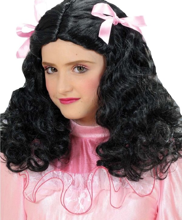 Peruca Printesa Bruneta cu doua fundite roz aplicate. O peruca din fibra sintetica pentru fetite, care asteapta sa fie purtata la o serbare!