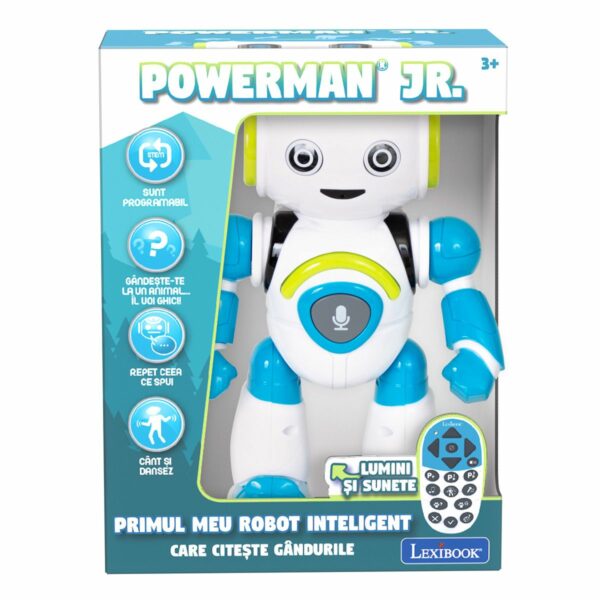 Powerman Jr. este un prieten amuzant si educativ pentru copiii isteti care vor sa invete prin joaca. Foloseste telecomanda ca sa il vezi deplasandu-se si dansand sau ca sa il inveti combinatii noi de miscari! Poti sa faci si karaoke: apasa pe butonul de inregistrare si apoi reda-ti vocea pe o melodie. In plus, ai doua jocuri educative despre animale – vezi daca Poweman Jr. poate sa-ti ghiceasca gandurile si sa afle la ce animal te gandesti, printr-o serie de intrebari SAU asculta-l imitand animale pe care tu trebuie sa le ghicesti. Pachetul contine: – robot Powerman® Jr;- telecomanda;- ghidul exploratorului de animale salbatice;- manual de instructiuni. Dimensiuni produs in ambalaj: 21 x 10 x 28 cmVarsta recomandata: 3 ani +Nota: Robotul functioneaza cu 5 baterii LR6/AA (nu sunt incluse). Avertisment: Nerecomandat copiilor cu varsta sub 3 ani. Contine piese mici care pot fi inghitite. Atentie! Pentru a curata produsul, stergeti-l la suprafata cu o laveta umeda. Nu il scufundati in apa, deoarece componentele electrice se pot defecta.