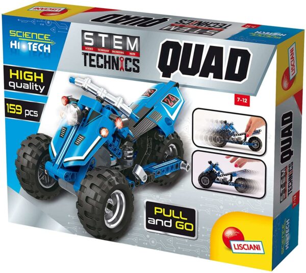 Descopera lumea jocurilor de constructie, intr-un mod complet nou, distractiv si educational. Caracteristici: setul de constructie contribuie la dezvoltarea abilitatilor motorii fine, a creativitatii, imaginatiei, indemanariiseturile STEM se bazeaza pe programa scolara STEM (science, technology, engineering and mathematics) in care copiii invata la o singura materie stiinta, tehnologie, inginerie si matematicaaceasta paradigma se bazeaza pe experimente cu elemente din viata de zi cu zi care sa ii ajute pe cei mici sa inteleaga cu usurinta diferite fenomene si concepteideal pentru familiarizarea cu notiuni primare de inginerie si designpentru a pune ATV-ul in miscare trebuie doar sa tragi de el in spate si sa ii dai drumulpentru functionare nu necesita baterii Setul include: 159 de piese pentru a construi ATV-ul Dimensiune ambalaj: 38.8 x 28.5 x 5.7 cm Varsta recomandata: 7 ani+ Atentie! Contraindicat copiilor mai mici de 3 ani. Jucaria/produsul poate contine piese mici care se pot inghiti sau inhala existand pericolul de sufocare sau nu este potrivita copiilor mai mici de 3 ani. Nu lasati ambalajele jucariilor/produselor la indemana copiilor. Indepartati orice ambalaj al jucariei/produsului inainte de a da jucaria/produsul copilului. Va rugam sa supravegheati copilul in timp ce se joaca/foloseste acest produs. Pastrati instructiunile si etichetele pentru referinte viitoare. Pastrati jucaria/produsul departe de foc, feriti jucaria/produsul de temperaturi ridicate si umiditate.