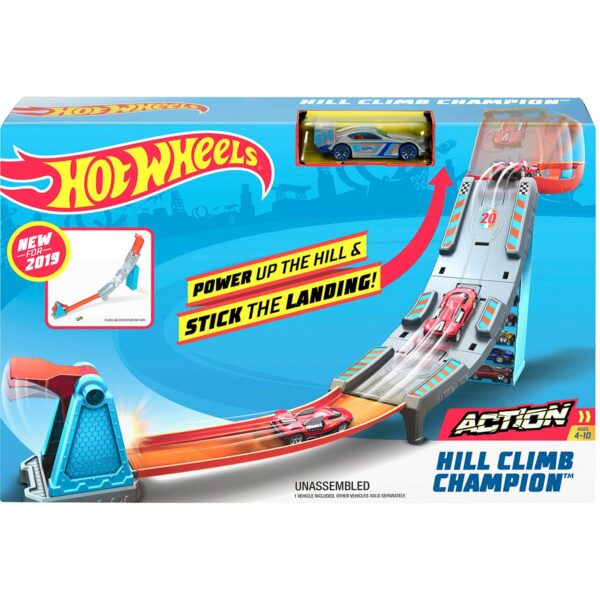 Testeaza abilitatile tale si prietenilor tai cu noile provocari de la Hot Wheels. Acest set este disponibil in 3 modele diferite: un circuit de drift, o cursa de tractiune si un lansator pentru sarituri indraznete. Fiecare set include o masinuta. Pachetul contine:- 1x circuit Hill Climb Champion GBF83- 1x masinuta Hot Wheels Dimensiuni produs in ambalaj:?38 x 7.5 x 25.5 cmVarsta recomandata:?4 ani + Atentie!?Contraindicat copiilor mai mici de 3 ani. Jucaria poate contine piese mici, care se pot inghiti sau inhala, existand pericolul de sufocare.